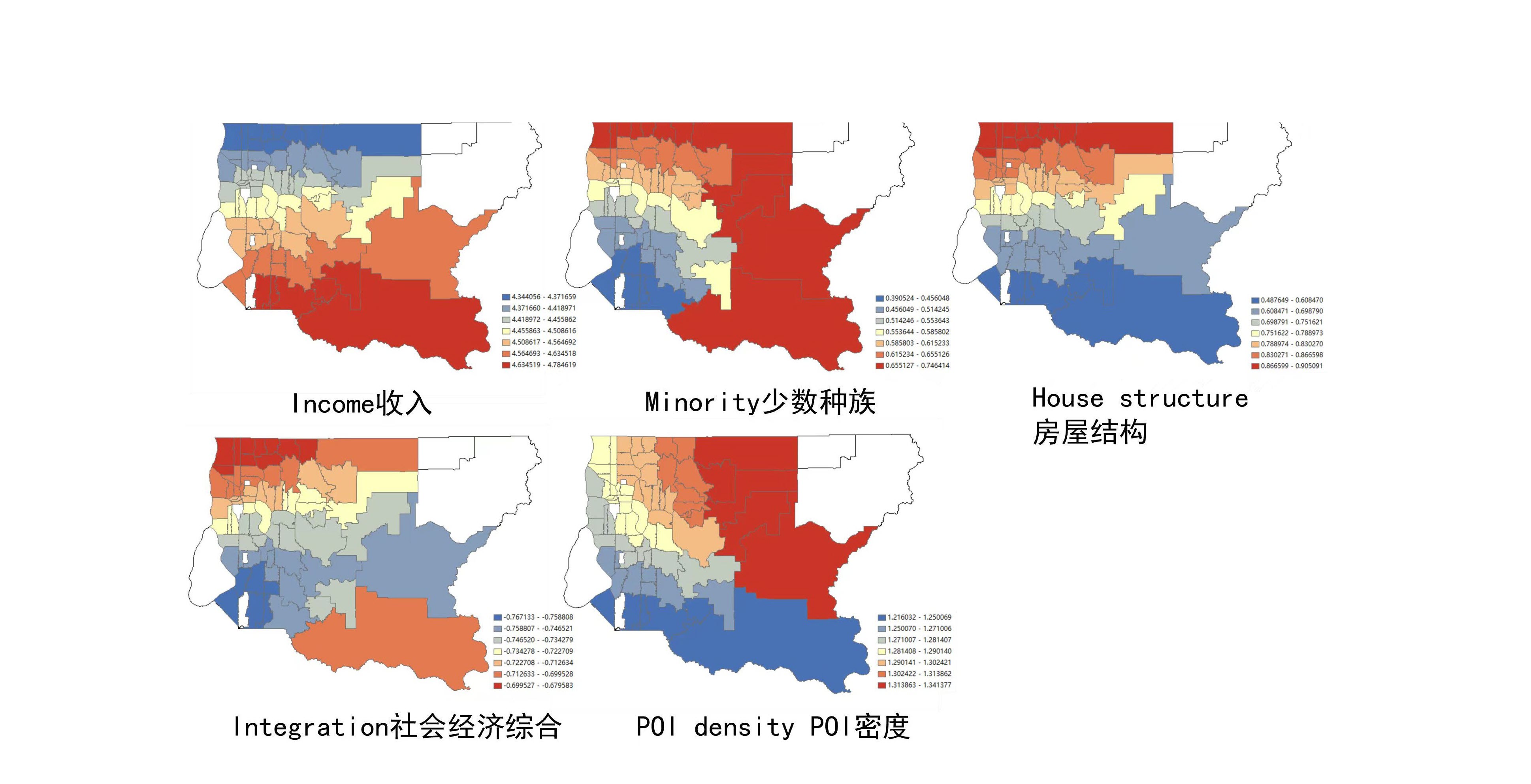 • 建成环境密度与发病率呈正相关。 • Increased open space is conducive to reducing incidence rates and overcrowded households leads to an increase in incidence rates.