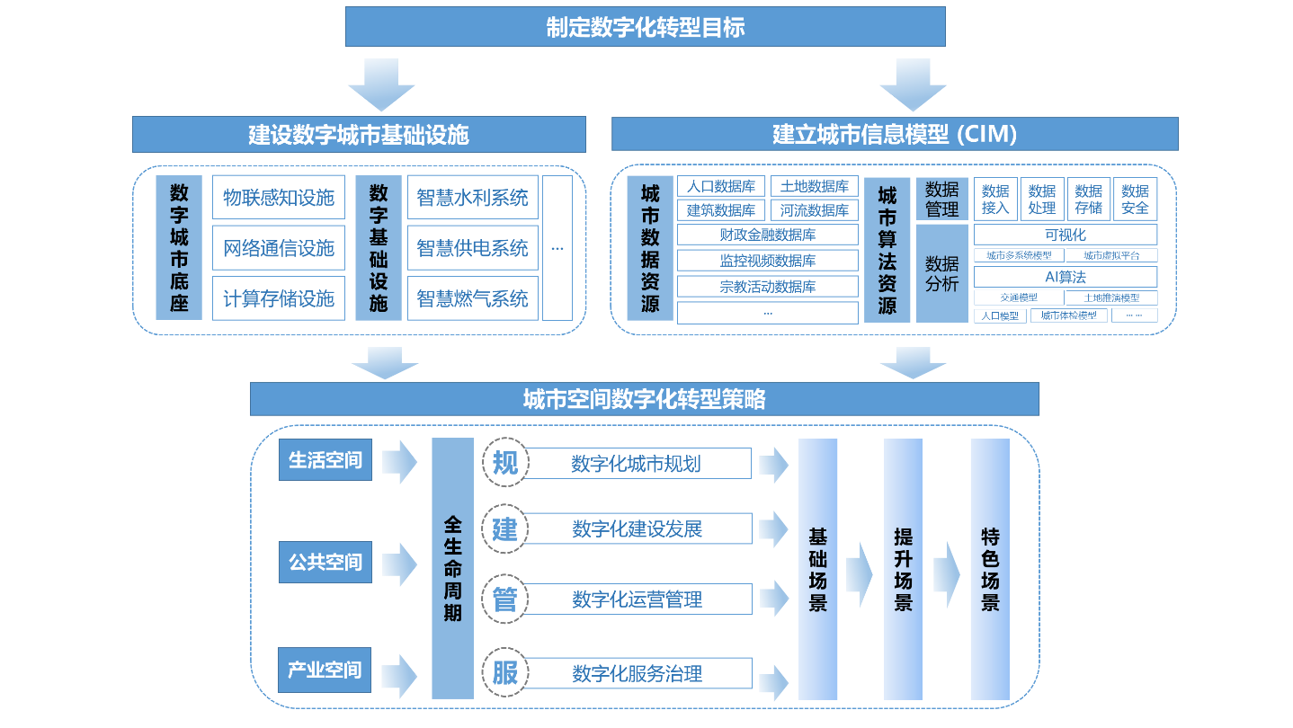 • 提出了一个涵盖现状分析、目标制定、基础设施建设、智能模型构建及数字化转型策略的城市空间数字化转型规划框架。